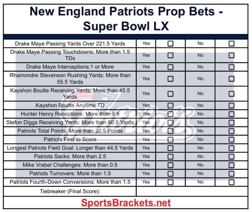Hier is een afdrukbaar New England Patriots propweddenschap voor Super Bowl LX voor jou. Het PDF-formaat staat hierboven en het afbeeldingsformaat van het propweddenschap staat hieronder voor u.