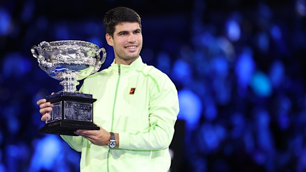 Carlos Alcaraz uit Spanje met de trofee na het winnen van de Australian Open 2026. Getty