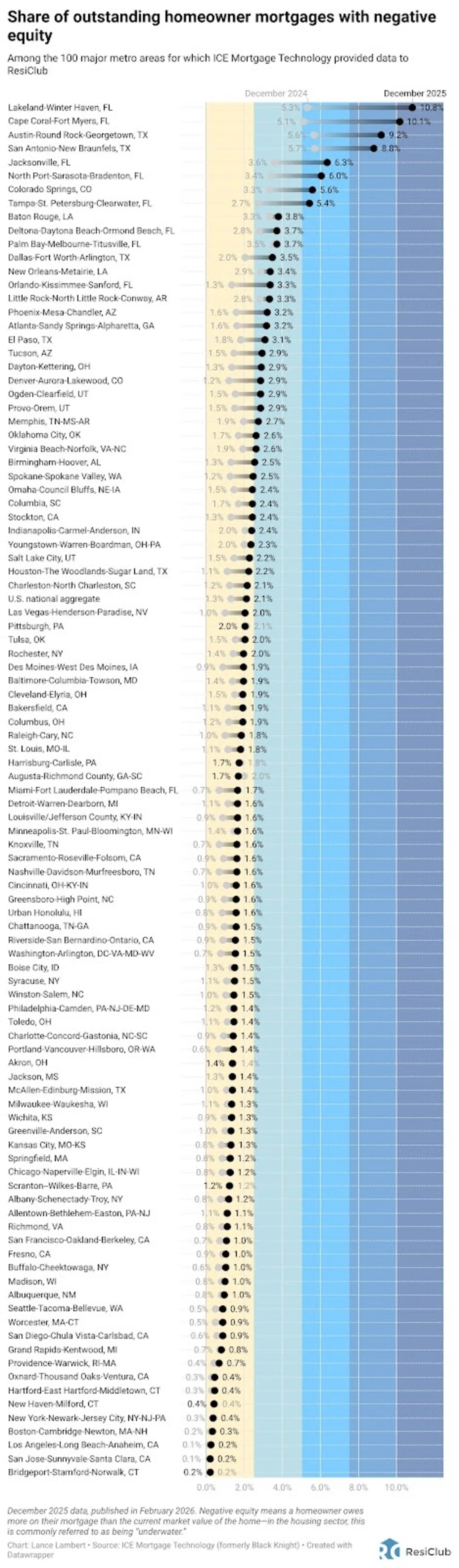 2,1% —> Het aandeel van de uitstaande hypotheken van Amerikaanse huiseigenaren met een negatief eigen vermogen* (d.w.z. onder water) tegen eind december 2025, volgens gegevens van ICE Mortgage Technology die deze week aan ResiClub zijn verstrekt. In december 2024 is dit 1,3%.