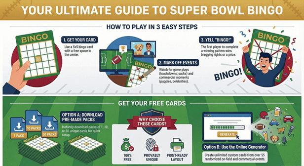 U kunt onze gratis online Super Bowl Bingo Card Generator bekijken op https://sportsbrackets.net/super-bowl-bingo-card-generator/ . Hiermee kun je een onbeperkt aantal aangepaste 5×5-kaarten maken met meer dan 55 willekeurige gebeurtenissen. Het omvat actie op het veld (touchdowns, zakken, penalty’s, toss-resultaten) en klassieke commerciële momenten (puppies, beroemdheden, bierreclames, grappige reclames), plus andere hoogtepunten van de speldag. De kaarten worden in een nieuw venster geopend, zodat ze eenvoudig kunnen worden afgedrukt of in PDF-formaat kunnen worden opgeslagen, met een overzichtelijke lay-out van 8,5 x 11, inclusief een opvallende ‘Super Bowl Bingo’-koptekst en SportsBrackets.net-voettekst.