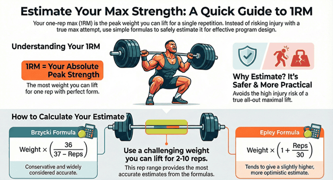 De rekenmachine schat u in 1RM (het zwaarste gewicht dat u één keer kunt tillen met een goede vorm) op basis van het gewicht dat u opheft voor een bepaald aantal herhalingen. Het maakt gebruik van twee populaire formules: