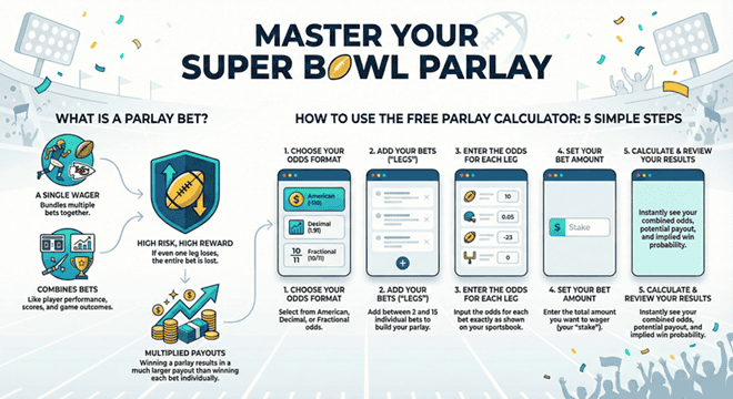 Hier leest u hoe u de gratis parlay oddscalculator kunt gebruiken die we voor fans hebben gepubliceerd. Nu Super Bowl LX nog maar een paar dagen verwijderd is (8 februari 2026 – New England Patriots vs. Seattle Seahawks in Levi’s Stadium), houden veel fans parlays om beter van de dag te genieten. Of u nu spelersrekwisieten combineert (zoals Sam Darnold boven 1,5 TD of Kenneth Walker op elk moment TD), weddenschappen op hetzelfde spel stapelt of March Madness-beugelsets test, onze gratis Parlay Odds Calculator maakt het gemakkelijk om potentiële uitbetalingen, impliciete kansen en meer te zien, zonder enige registratie of reclame.