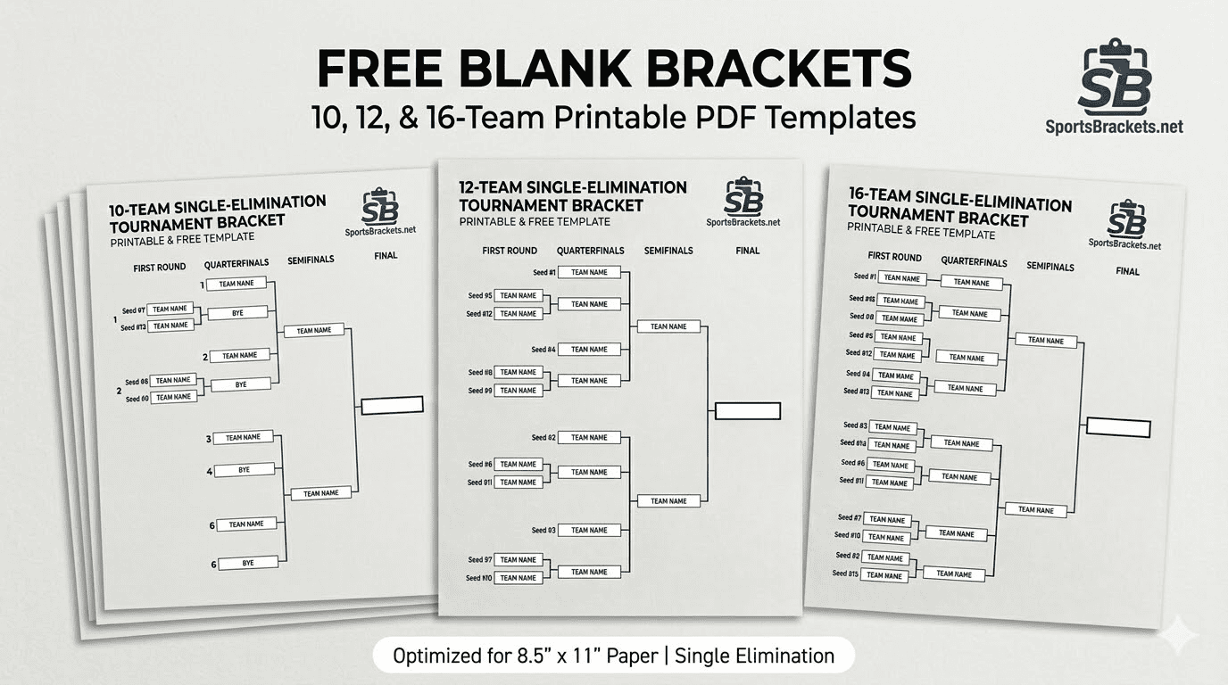 Of je nu een plaatselijk jeugdtoernooi, een pickballcompetitie of een speciale kantoorpool voor March Madness organiseert, het hebben van een schone, professionele groep is essentieel. Hieronder bieden wij u een gratis, hoogwaardige, printbare blanco toernooibeugel aan. Sjablonen in PDF- en afbeeldingsformaten voor velden met 10 teams, 12 teams en 16 teams. Deze beugels zijn ontworpen voor spellen met enkele eliminatie en zijn geformatteerd voor standaard papier van 8,5 x 11 inch.