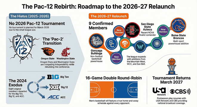 De Pac-12 zal volledig opnieuw gelanceerd worden Seizoen 2026-27 (vanaf 1 juli 2026) met negen leden, waaronder extra krachtpatsers als Gonzaga. De conferentietoernooien zullen naar verwachting dit jaar worden hervat Maart 2027 (mogelijke enkele eliminatie, met uitzendingen van USA Network en CBS volgens recente mediadeal). Deze pagina legt de situatie uit, geeft een overzicht van de binnenkomende teams en biedt bronnen voor fans om het nieuwe tijdperk te volgen.