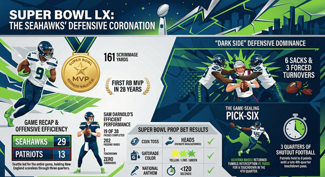 De wedstrijd was nooit echt spannend, aangezien de best gerangschikte verdediging van de Seahawks (bijgenaamd de ‘Dark Side’ onder coördinator Mike Macdonald) Patriots quarterback Drake Maye onderdrukte, hem zes keer ontsloeg, drie omzet afdwong (inclusief twee onderscheppingen), en de nacht afsloot met een pick-zes. Aanvallend, teruglopend Kenneth Walker III nam de last op zich en verdiende de Super Bowl MVP-onderscheiding in een optreden dat de ground-and-pound-stijl van vroegere kampioenen weerspiegelde.